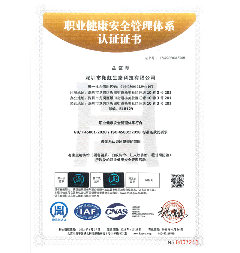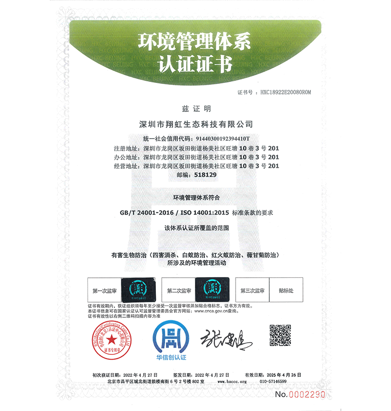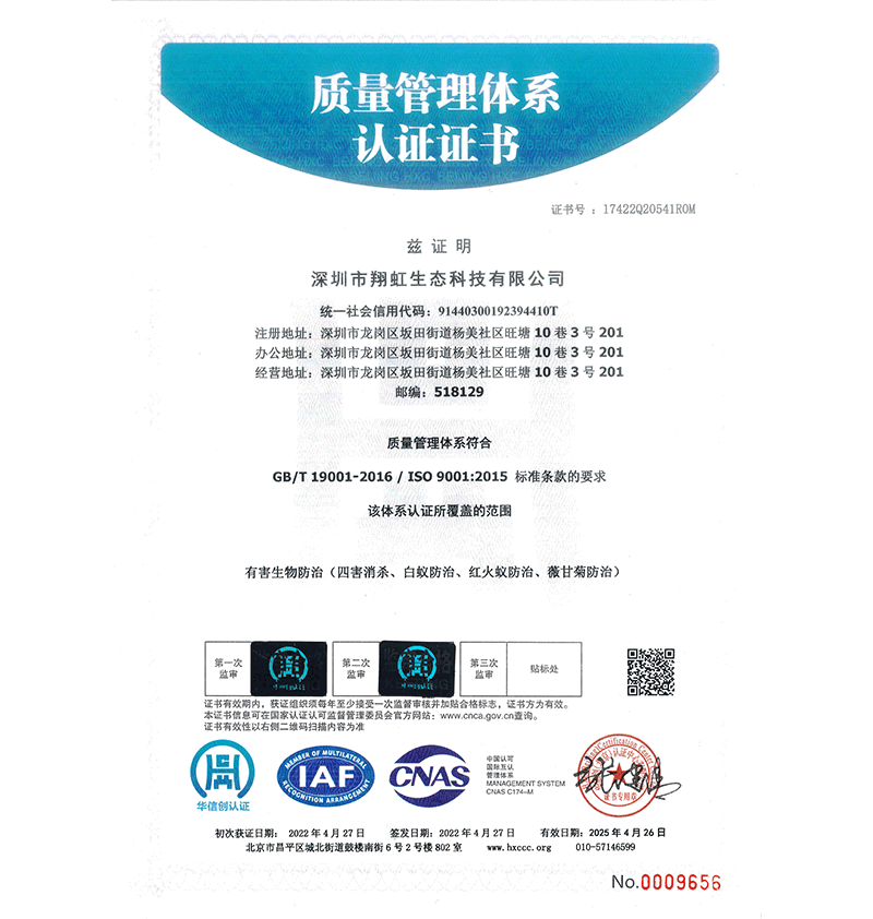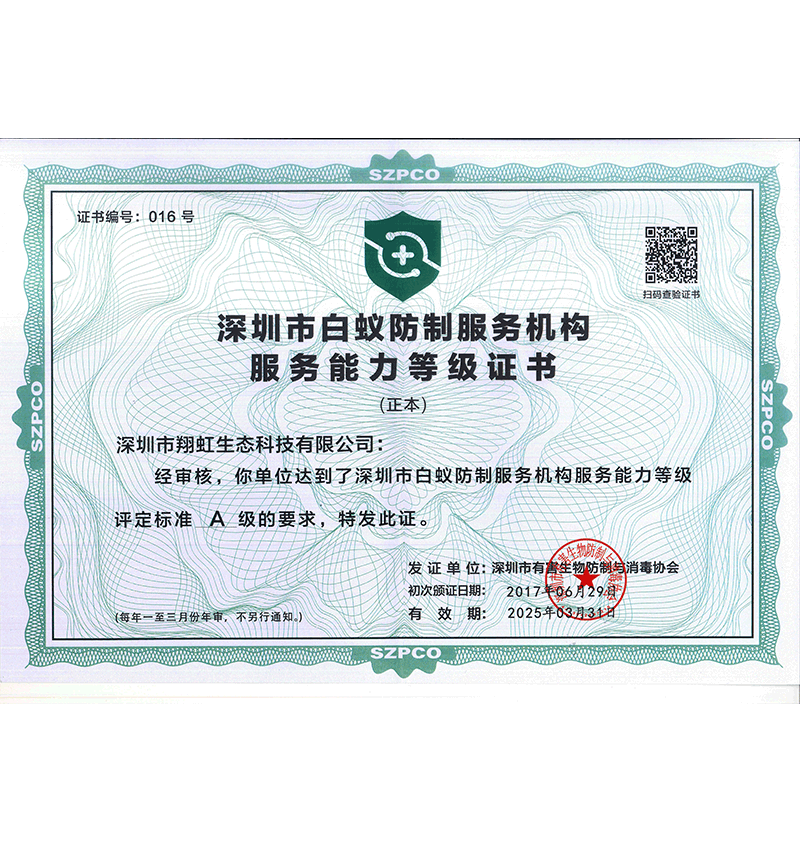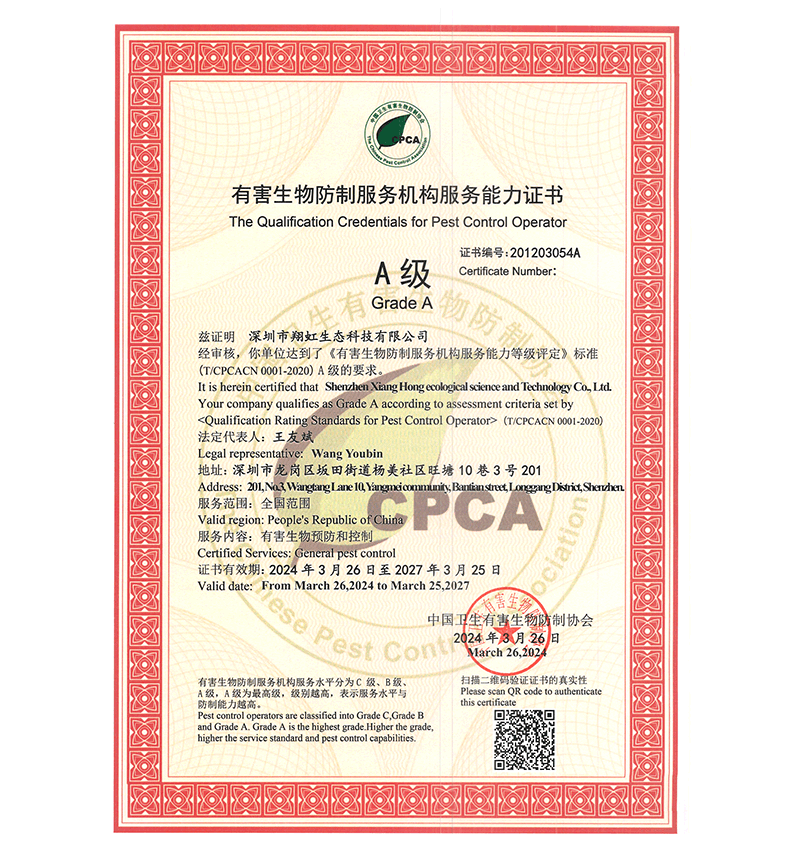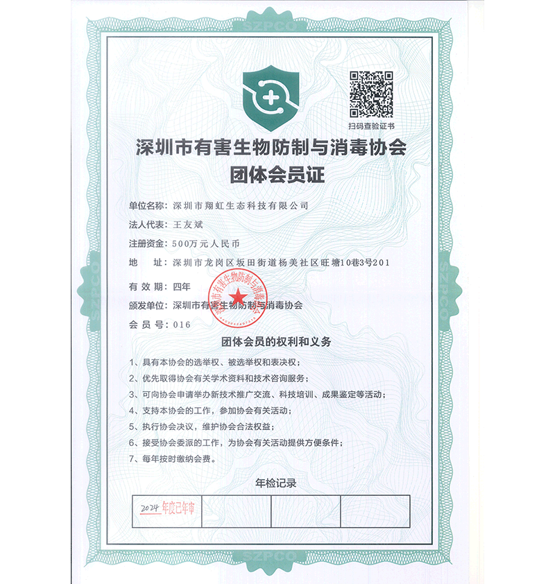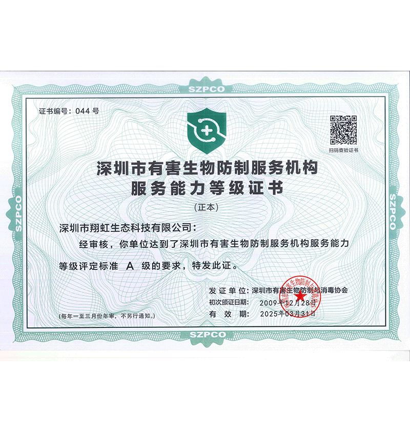 深圳市翔虹生態(tài)科技有限公司成立于1995年,是深圳最早成立的專業(yè)蟲害防治公司之一。公司發(fā)展至今獲得全國有害生物防制服務A級資質(zhì)、廣東省有害生物防制服務A級資質(zhì)、深圳市有害生物防制服務A級資質(zhì)、廣東省有害生物防制服務A級資質(zhì)、深圳市有害生物防制服務甲級資質(zhì)的單位,是中國有害生物防治協(xié)會會員、廣東省有害生物防治協(xié)會會員、深圳市有害生物防治協(xié)會理事單位,多次獲得“深圳市十佳消殺單位”榮譽。